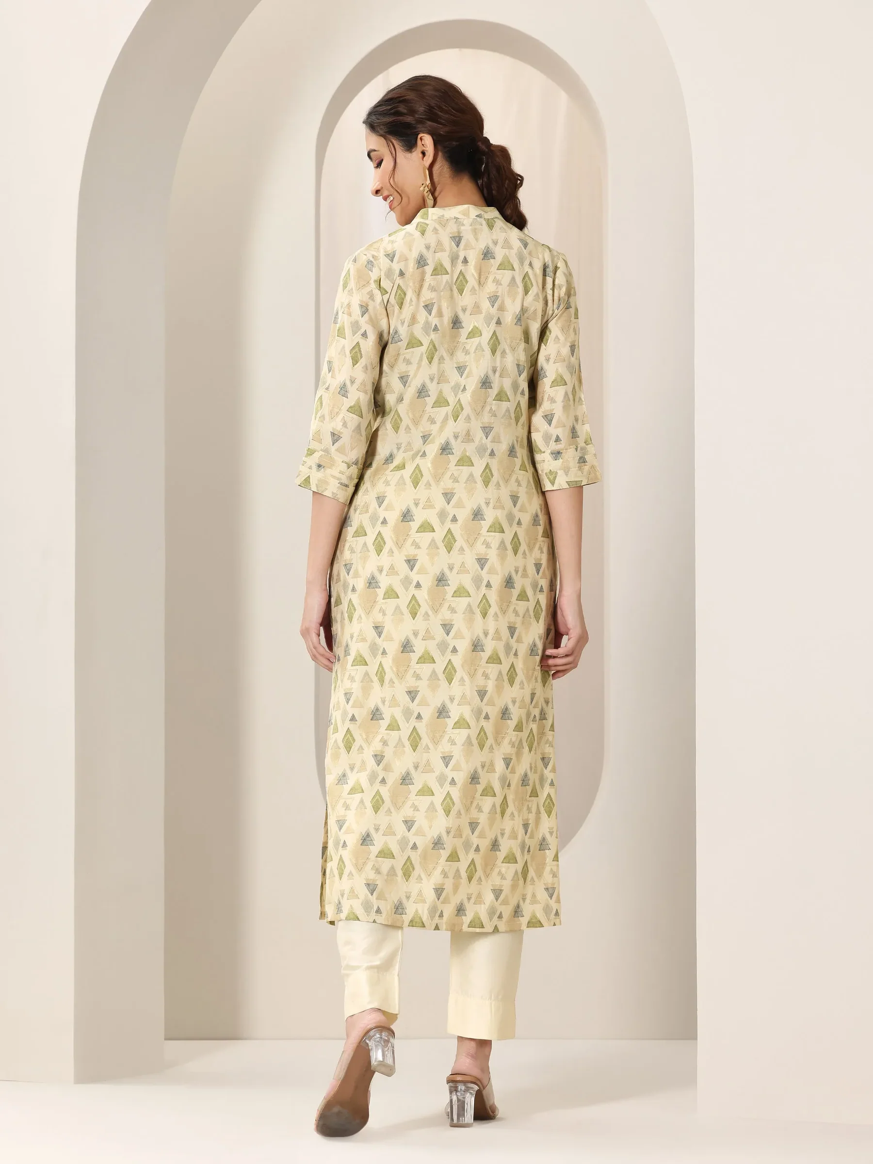 Beige Printed Silk Blend Straight Kurta