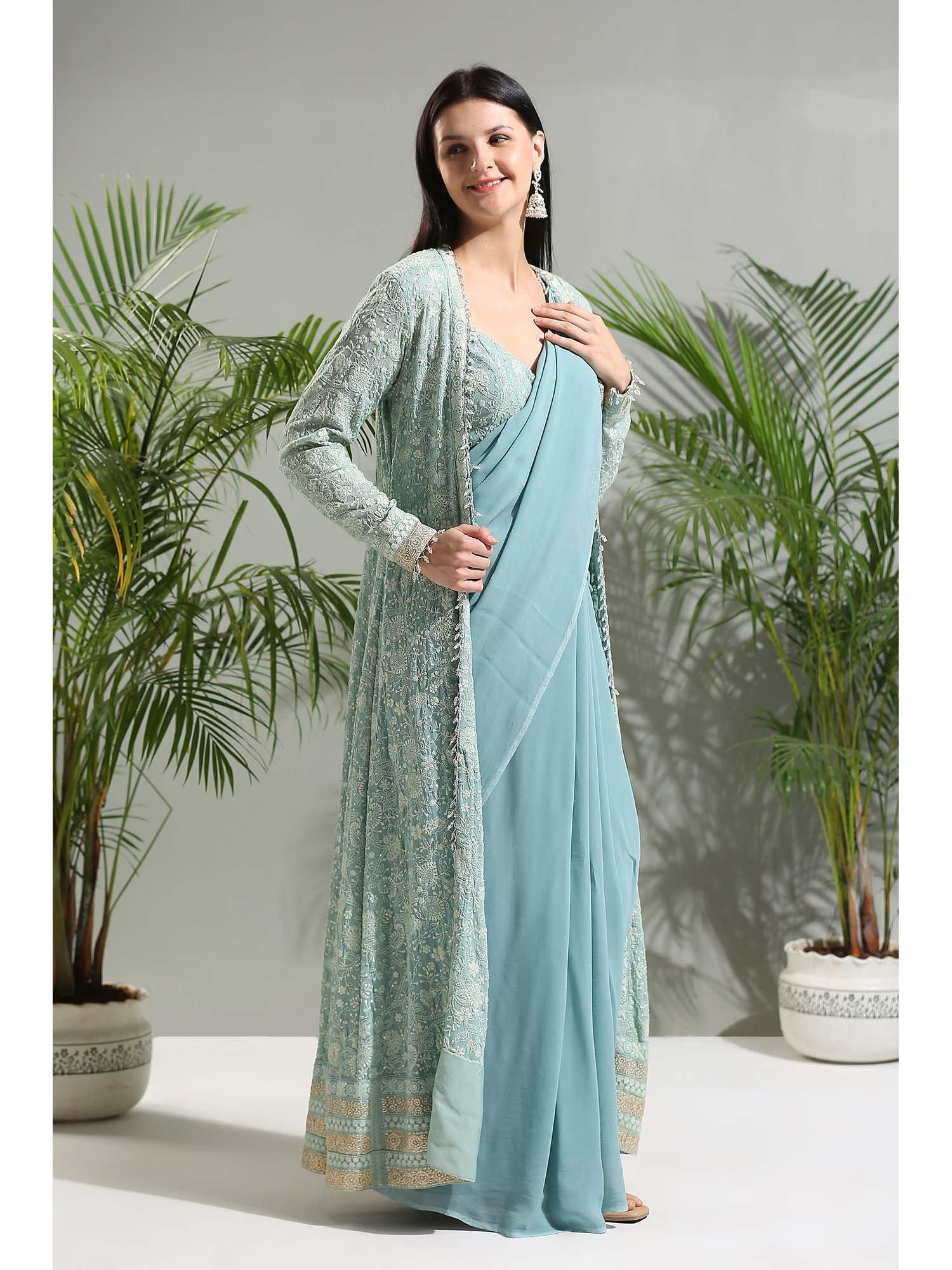 Dusty Blue Saree with Stitched Blouse and Jacket