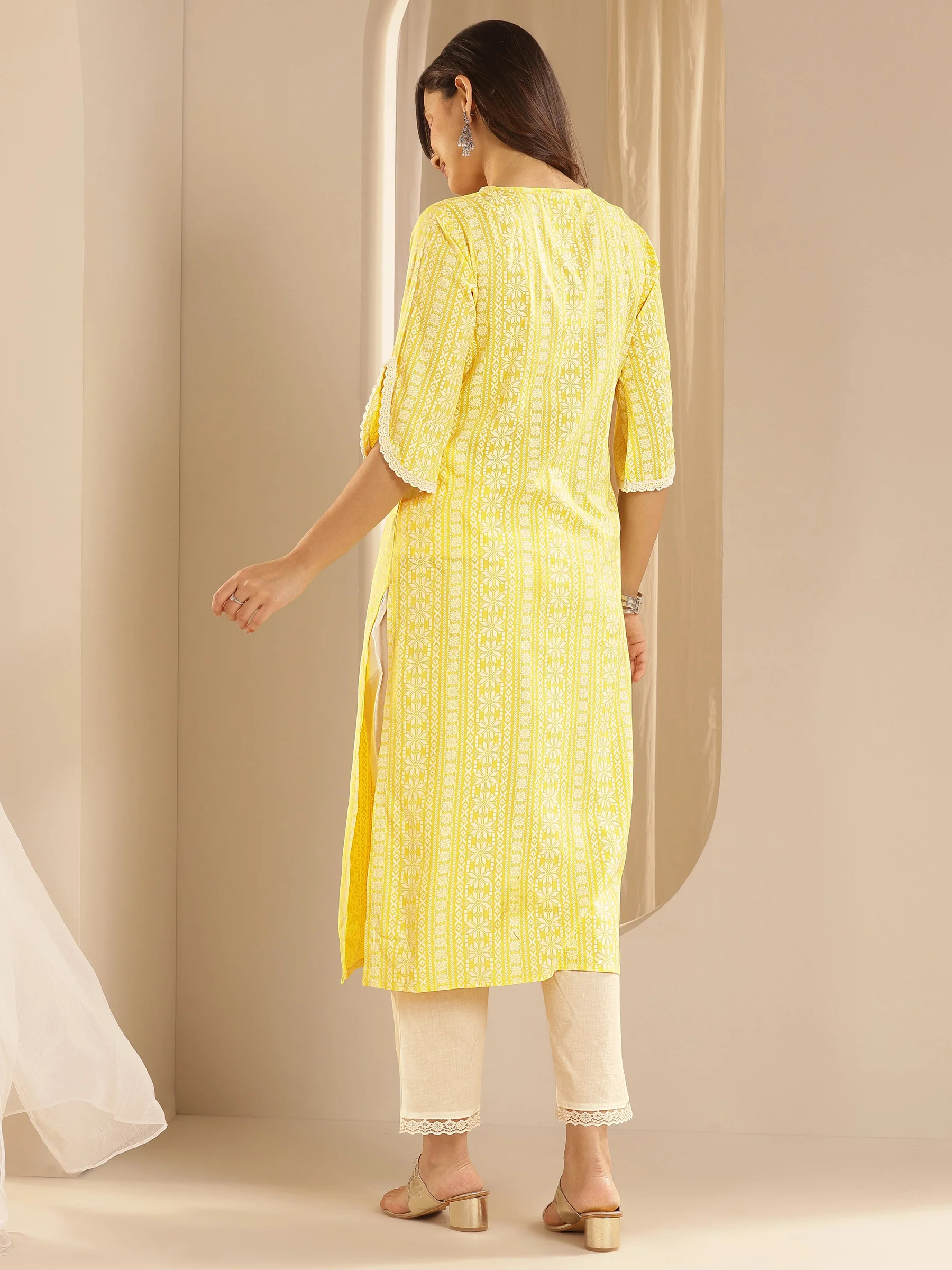 Yellow Printed Rayon Straight Kurta